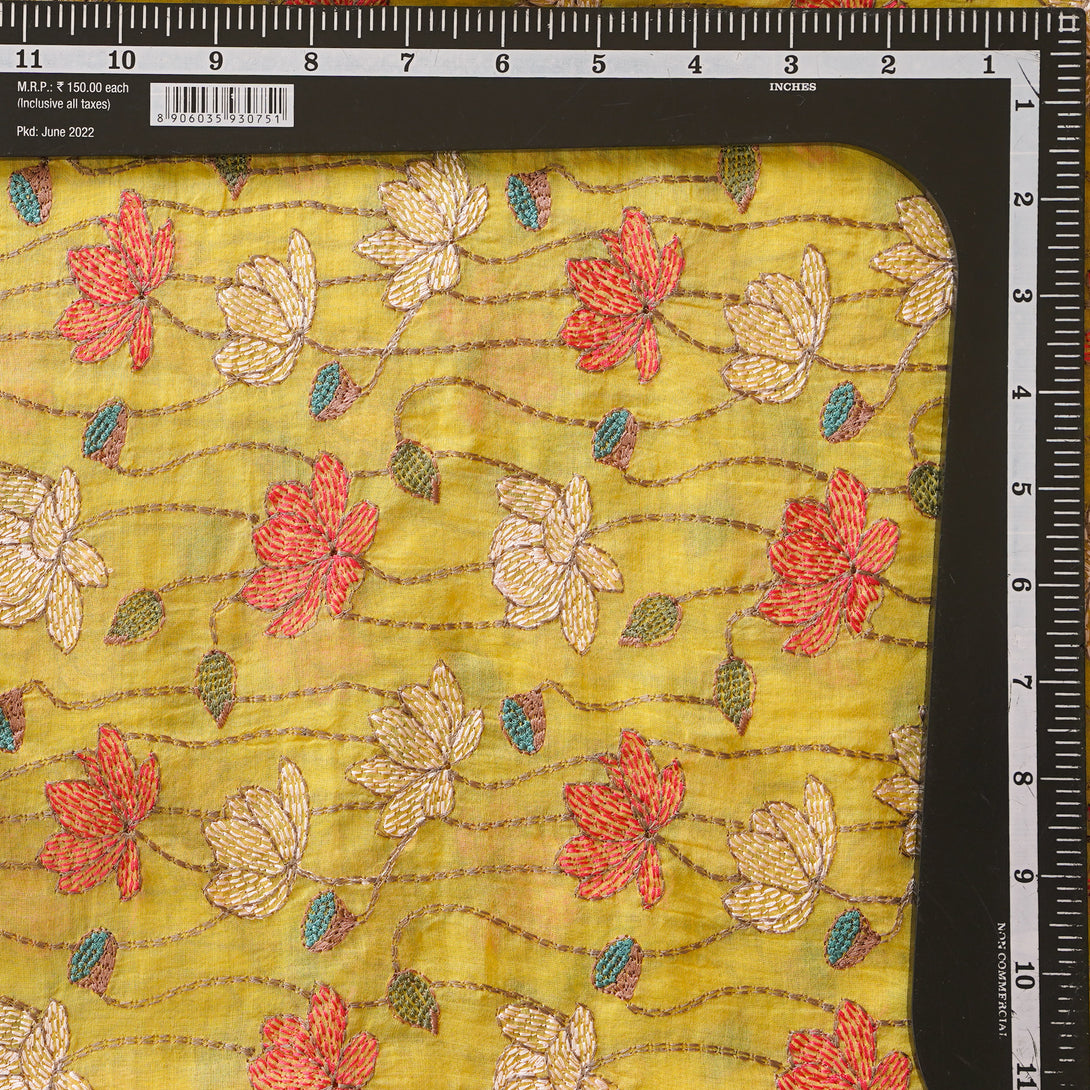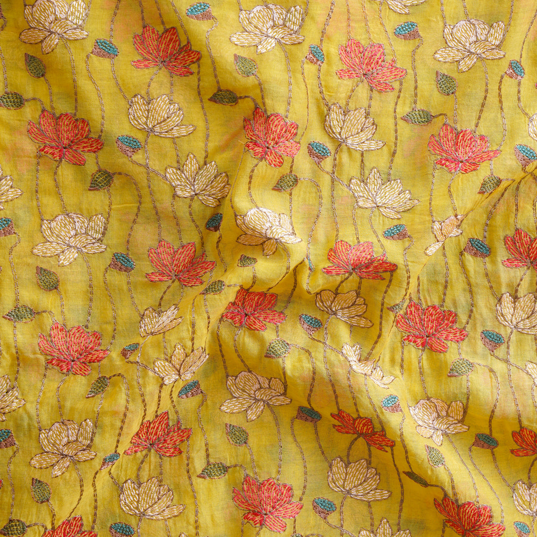 Mul Chanderi Yellow With Flower Jaal Embroidery Fabric