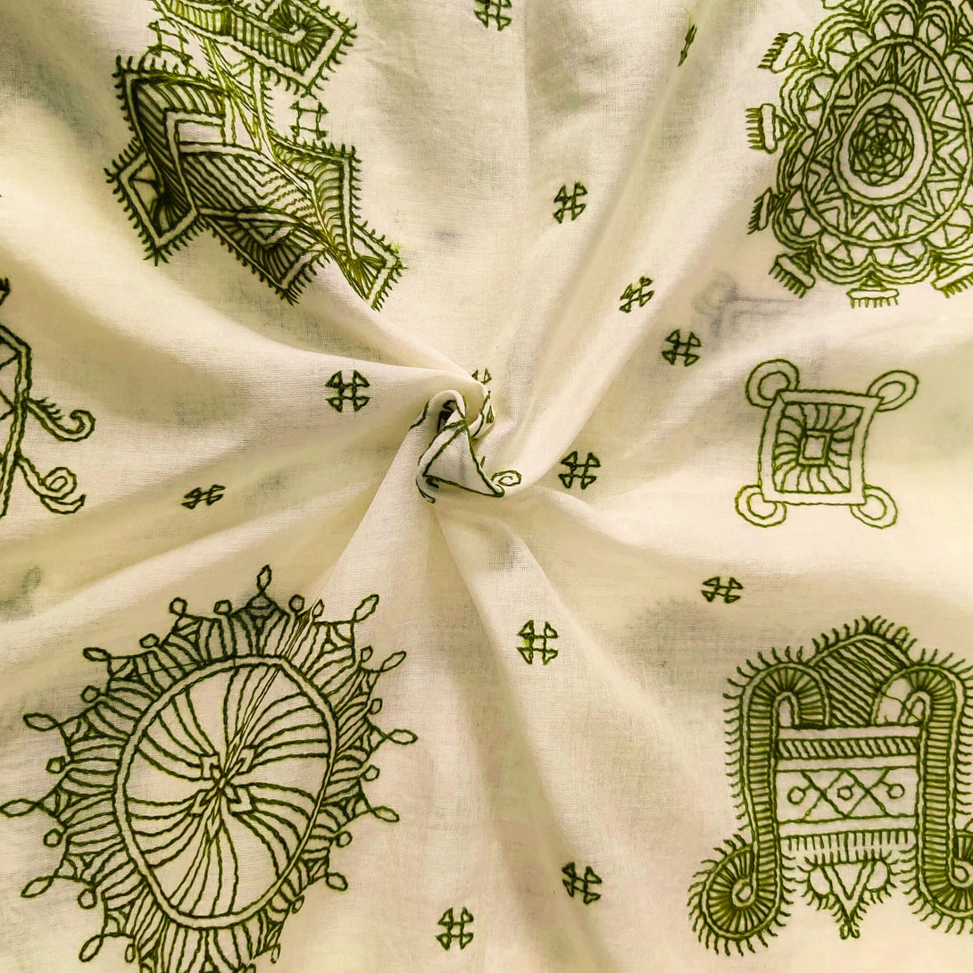 Mul Cotton Off White With Olive Green Kaatha Embroidery Fabric