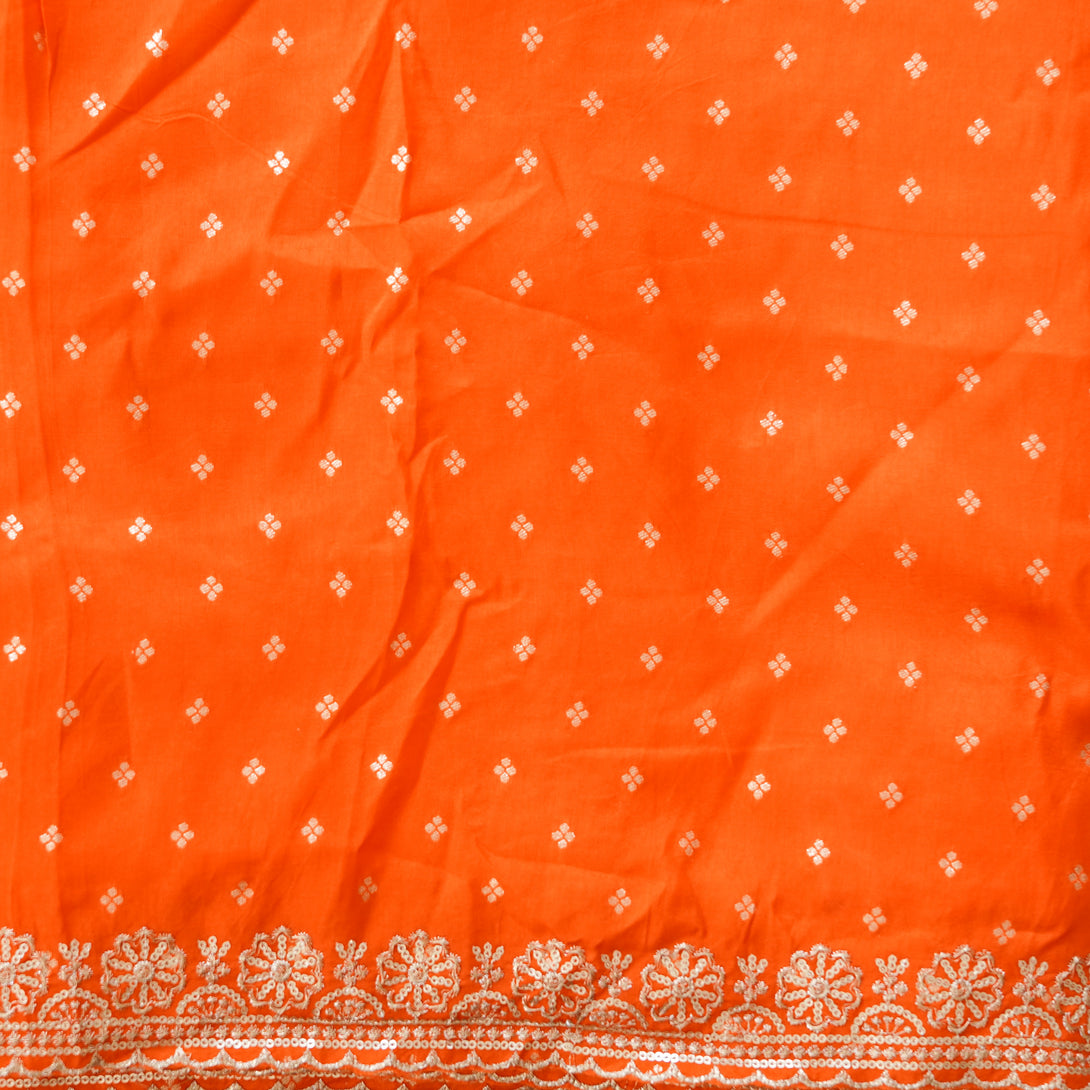 New Dola Silk Brocade Orange With Golden Zari Flower Butti and Zari Embroidary Border Fabric