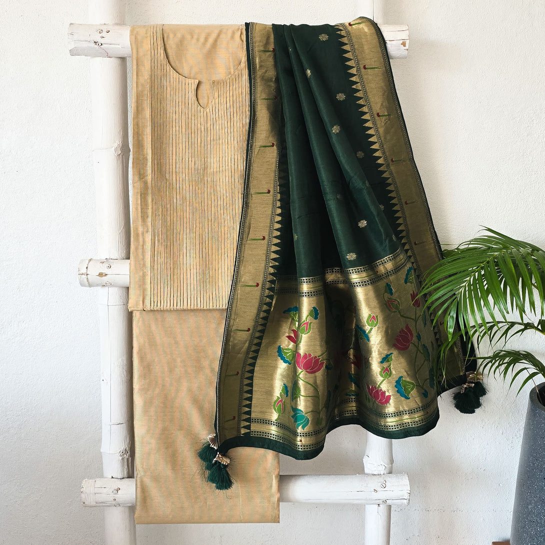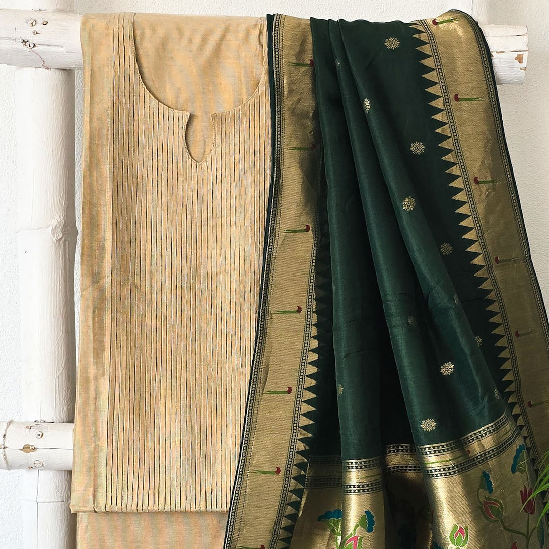 PAITHANI- Pintucks Cotton Silk Beige With Dark Green Paithani Dupatta Suit
