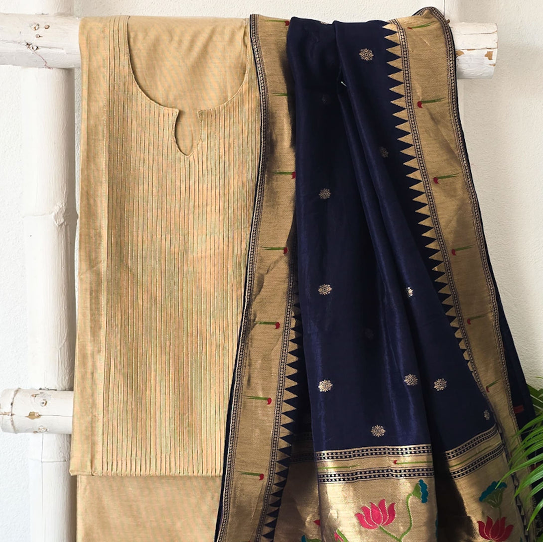 PAITHANI- Pintucks Cotton Silk Beige With Navy Blue Paithani Dupatta Suit
