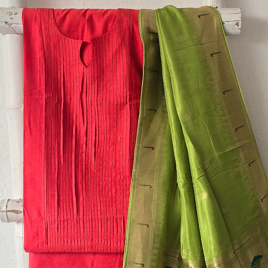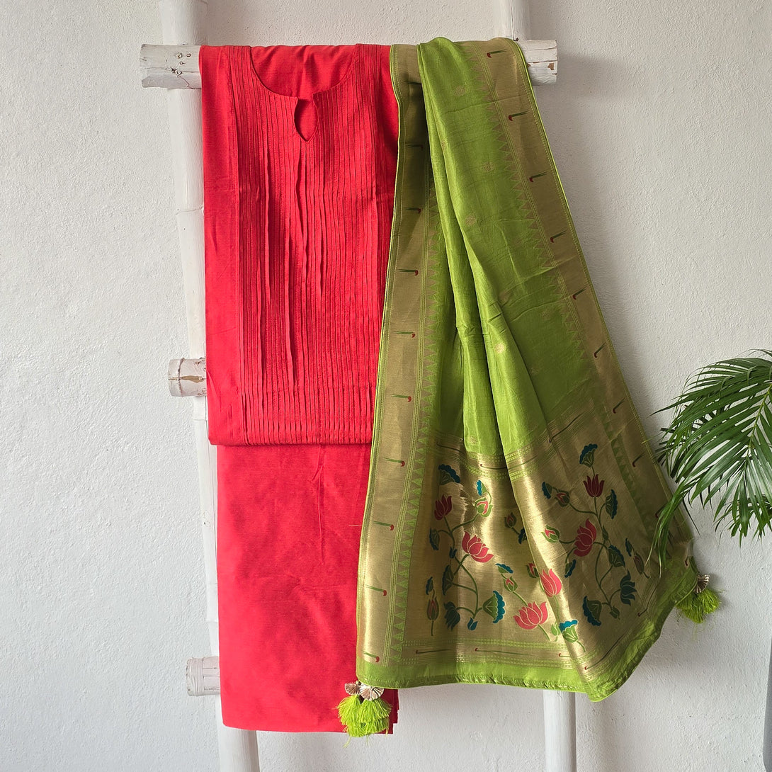 PAITHANI- Pintucks Cotton Silk Dark Peach With Parrot Green Paithani Dupatta Suit