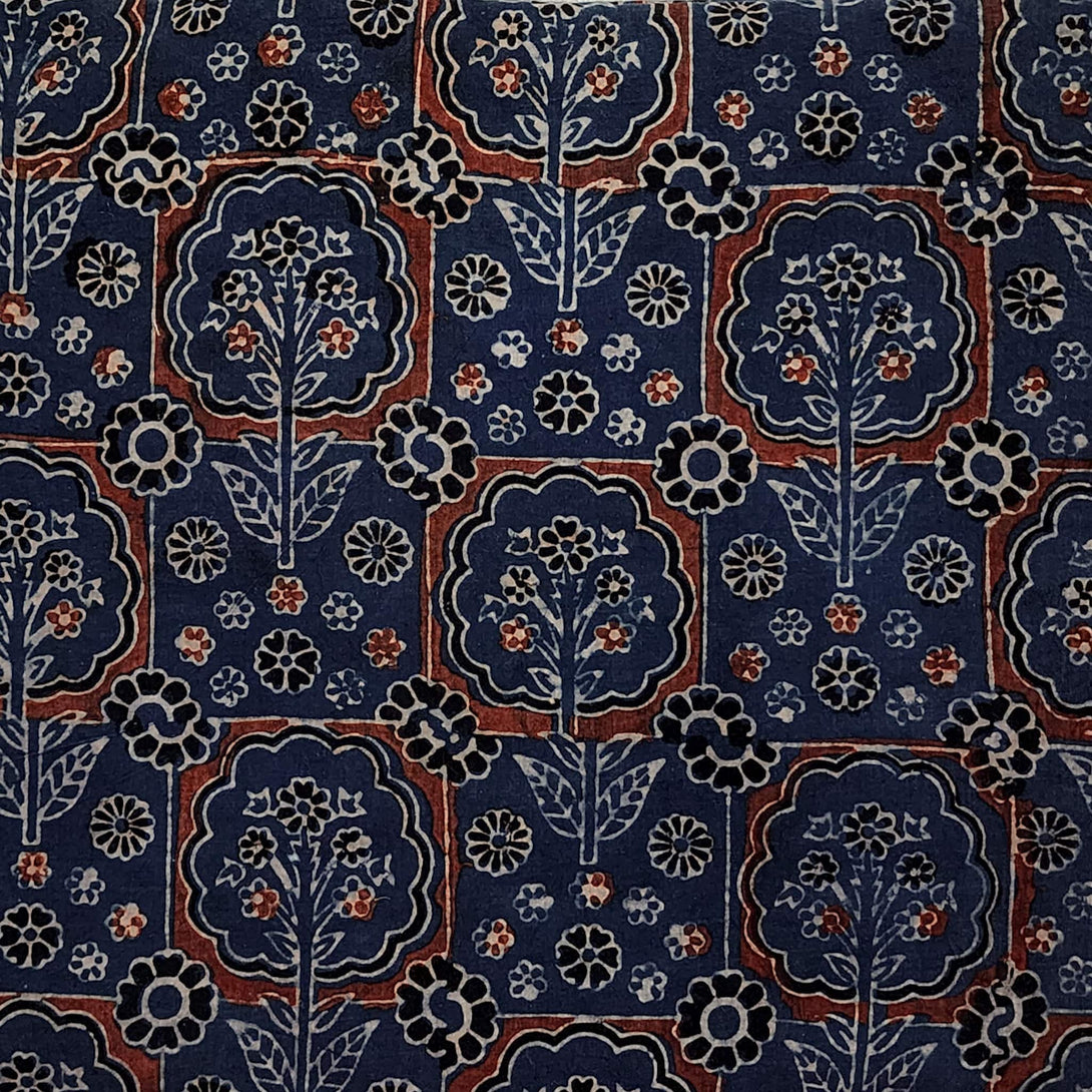 Per Cut (1.95 Meter) Pure Cotton Ajrak Blue With Squares And Floral Plants Motifs Hand Block Print Fabric