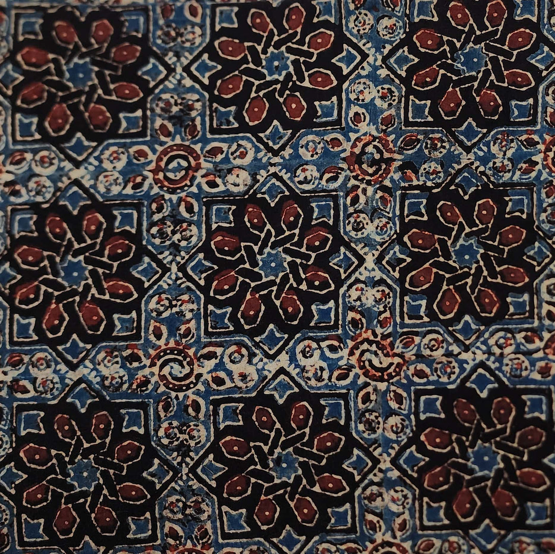 Per Cut (1 Meter) Pure Cotton Ajrak Black With Rust Blue Intricate Flower Design Hand Block Print Fabric