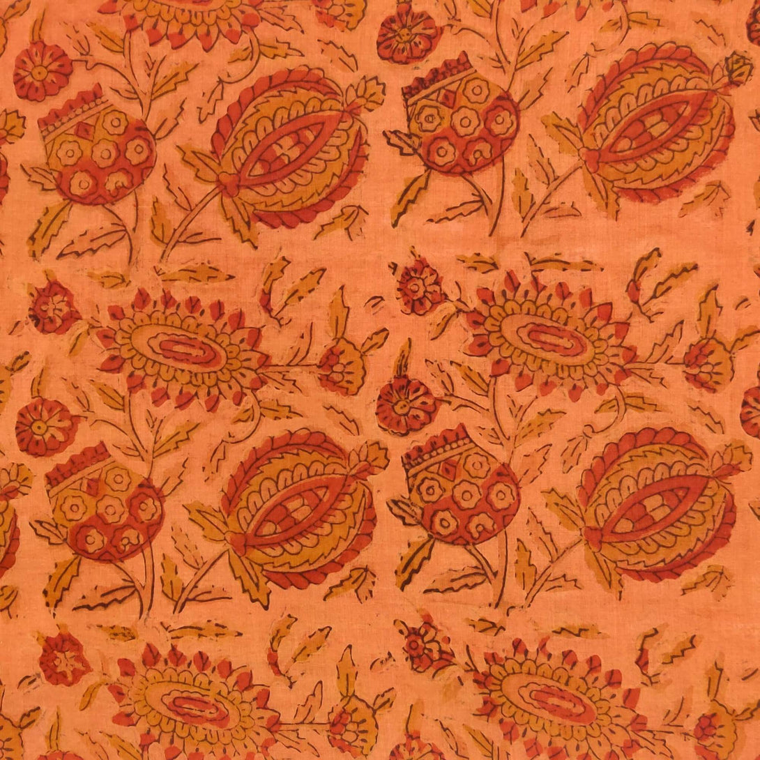 Pre-cut Pure Cotton Bhuj Teen Kaam Ajrak Rust Orange With Poppy Jaal Hand Block Print Fabric( 2 meter)