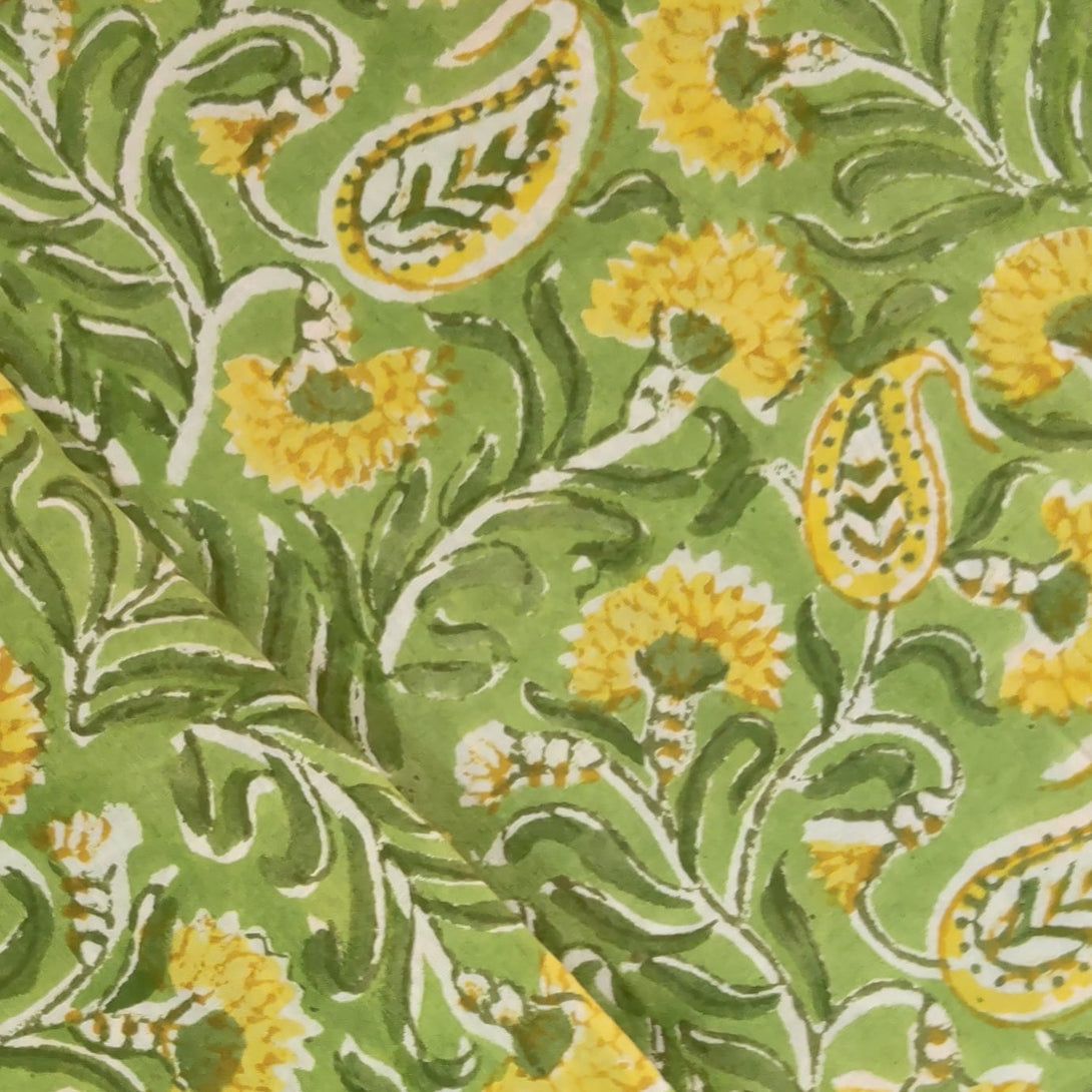 Pre-Cut (1.25 Meter )Pure Cotton Jaipuri Green With Yellow Kairi And Flower Jaal Hand Block Print Fabric