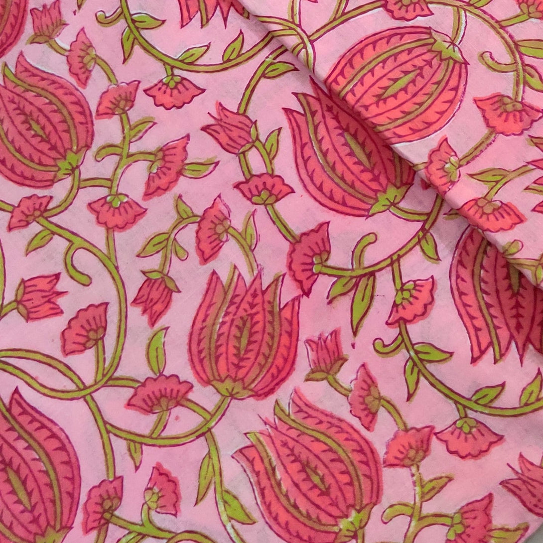 Pre-cut ( 1.25 ) Pure Cotton Jaipuri Pink With Lotus Jaal Hand Block Print Fabric