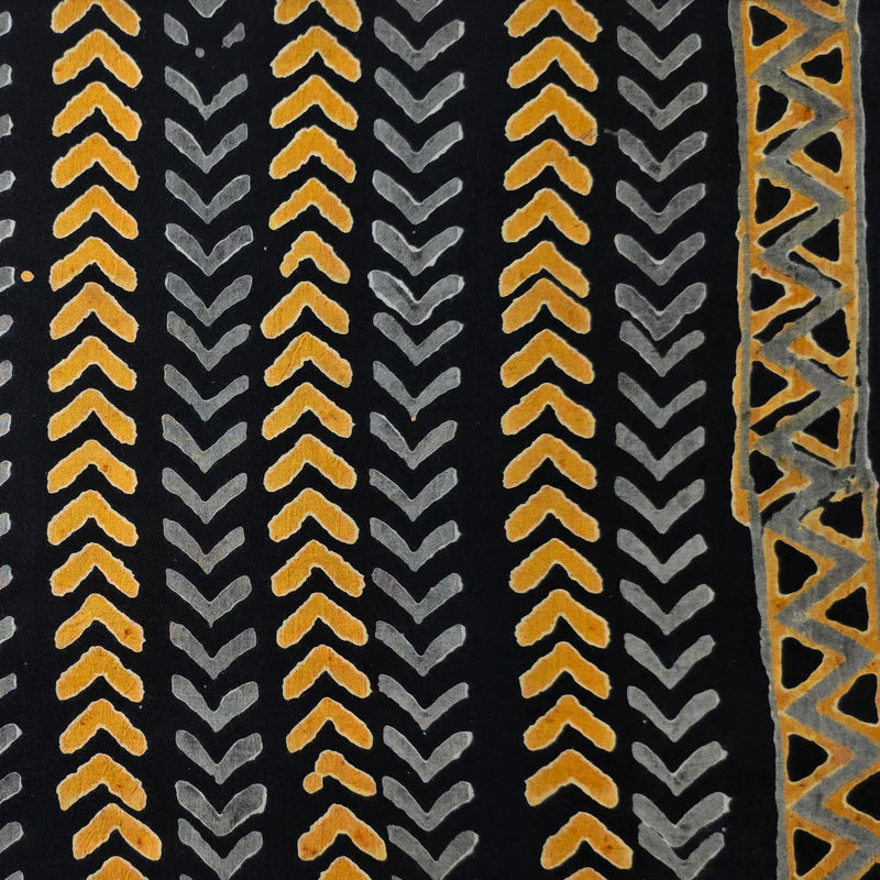 ( PRE-CUT 1.27 METER ) Pure Cotton Black With Small Yellow Grey Triangles With Border Hand Block Print Fabric