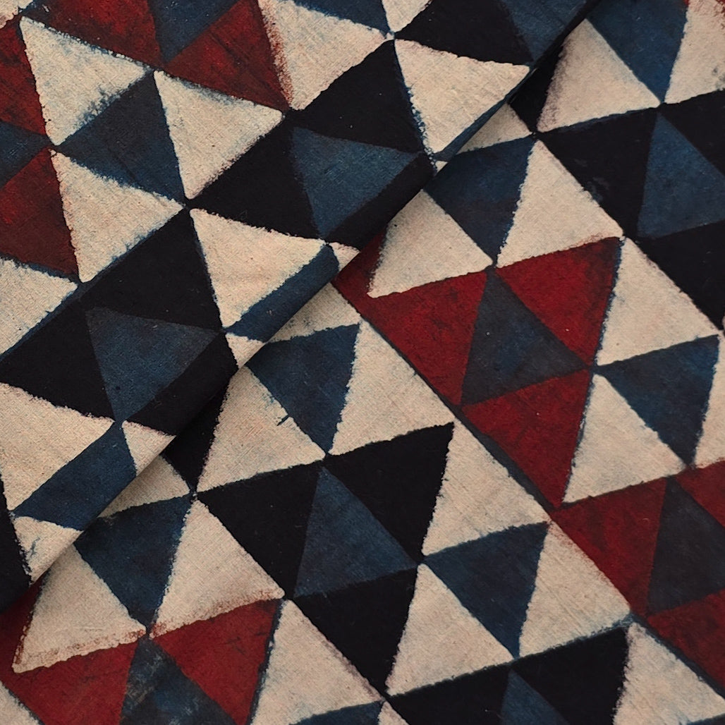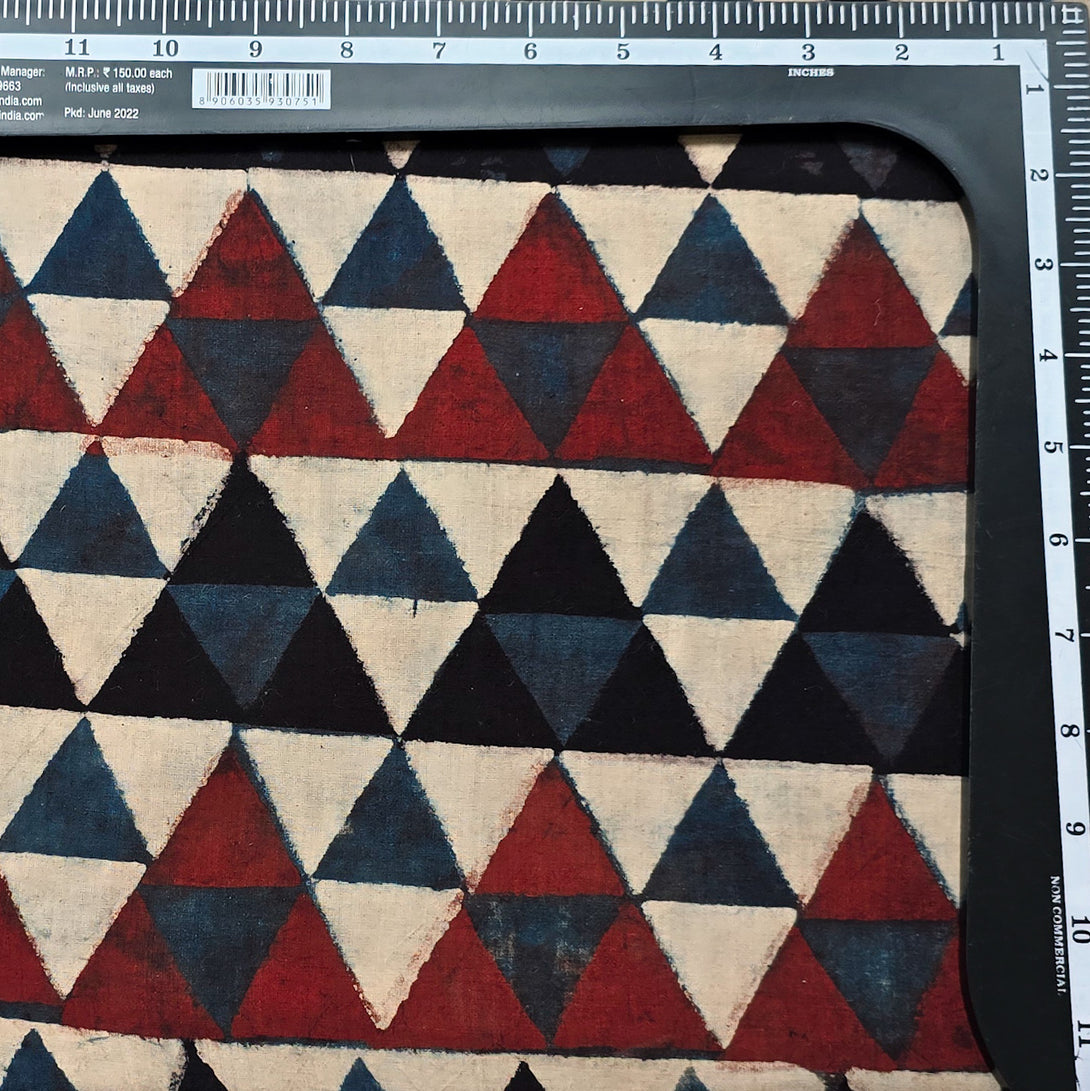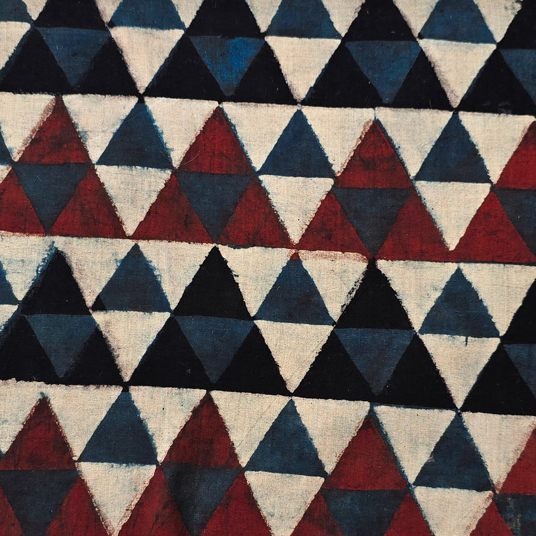 ( Pre-Cut 1.30 Meter ) Pure Cotton Ajrak Cream With Maroon And Rust Blue Triangle Hand Block Print Fabric