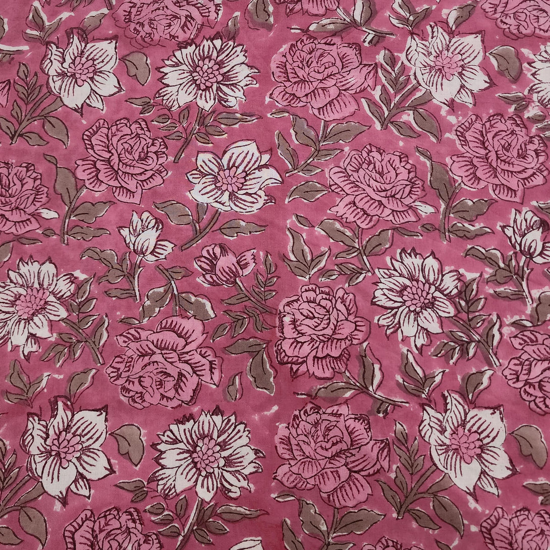 PRE-CUT 1.30 METER Pure Cotton Jaipuri Pink With Roses Hand Block Print Fabric