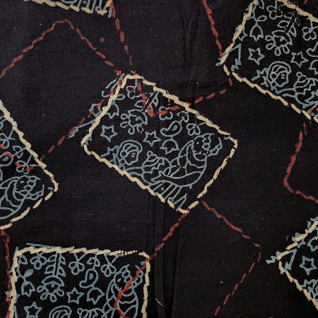 ( PRE-CUT 1.35 METER ) Pure Cotton Ajrak Black With Blue And Red Photo Frames Design Hand Block Print Fabric