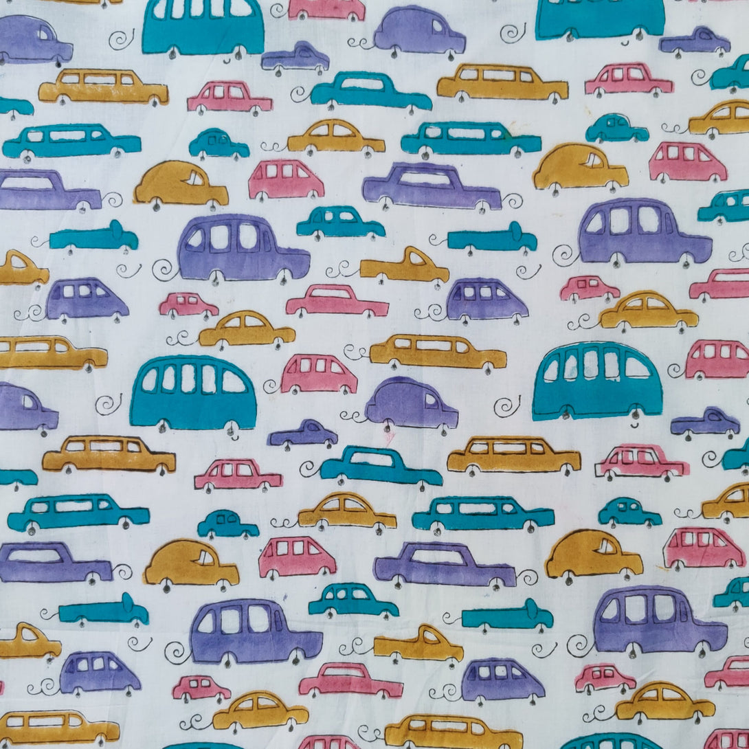 Pre-cut ( 1.35 Meter ) Pure Cotton Jaipuri White With Teal Mustard Pink Cars Hand Block Print Fabric