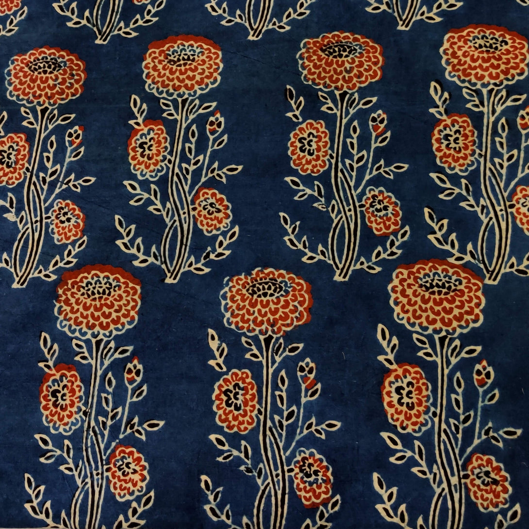 Pre-Cut 1.35 Meters Pure Cotton Ajrak Blue With Long Genda Phool Plant Hand Block Print Fabric