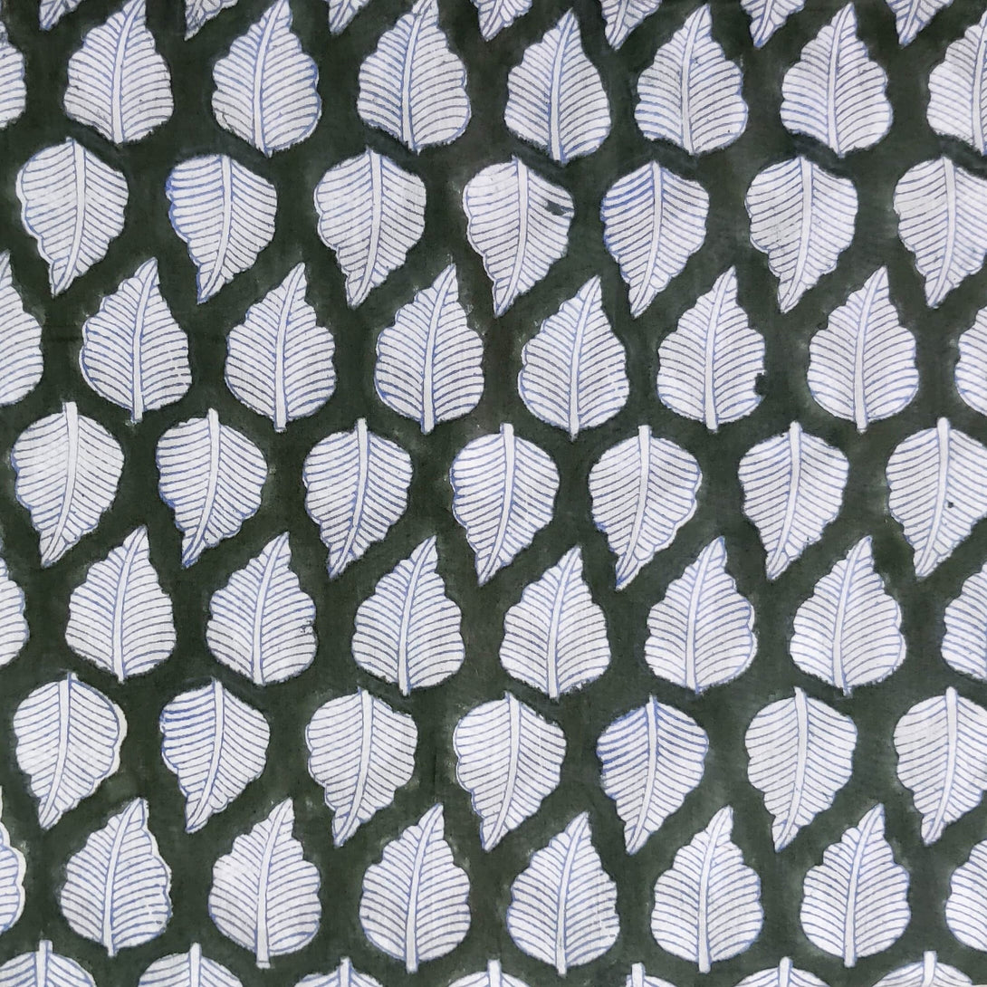 Pre-Cut 1.35 Meters Pure Cotton Jaipuri Dark Green With White Leaf Hand Block Print Fabric