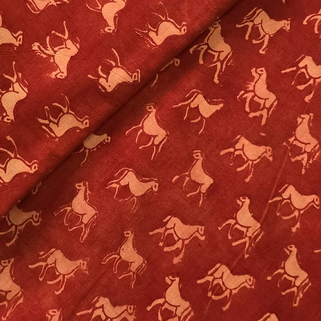 ( PRE-CUT 1.40 CM ) Pure Cotton Bagru Rust Orange With Light Orange Horse Hand Block Print Fabric