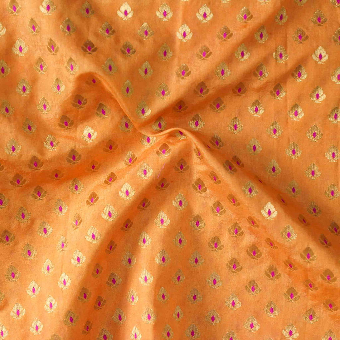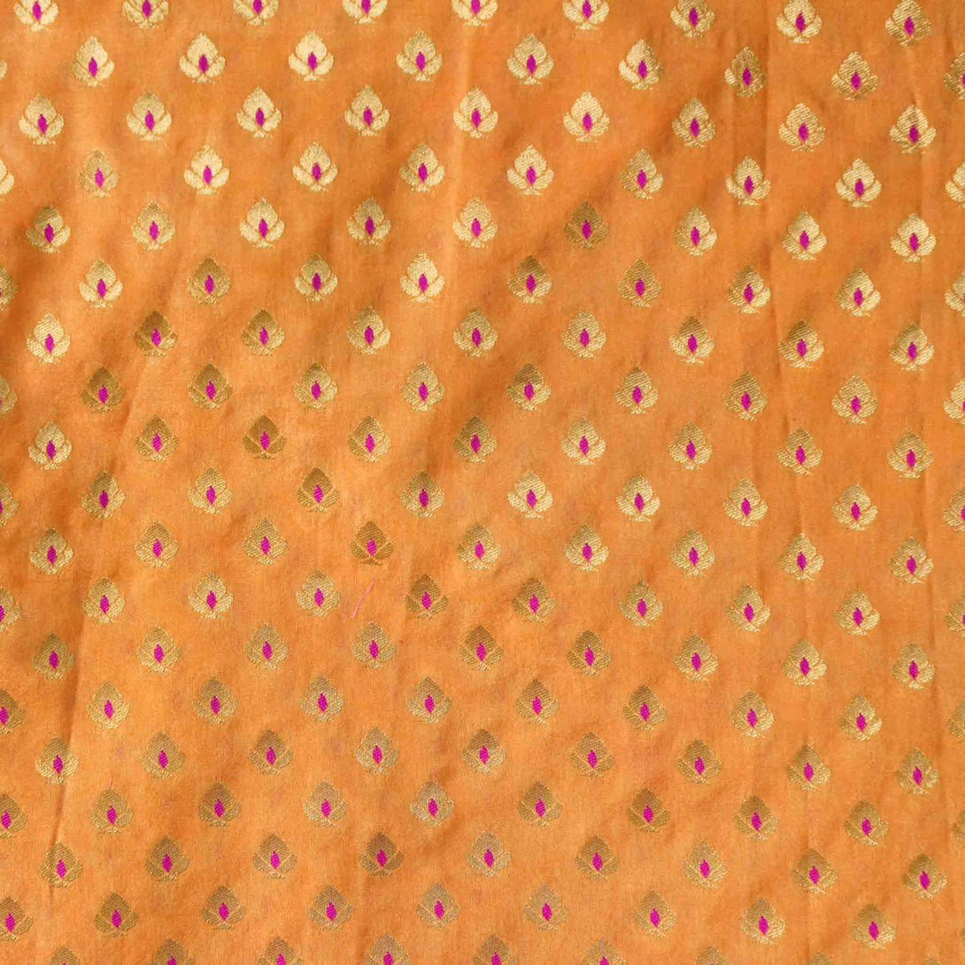 ( Pre-Cut 1.40 Meter ) Brocade Peach With Pink Flower Motif Hand Woven Fabric