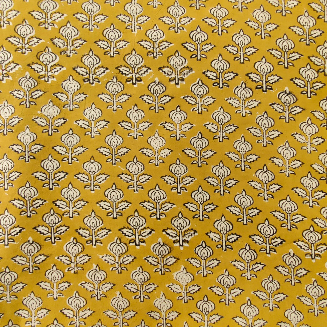 Pre- Cut 1.40 Meter Pure Cotton Bagru Mustard With Tiny Bud Plant Motif Hand Block Print Fabric