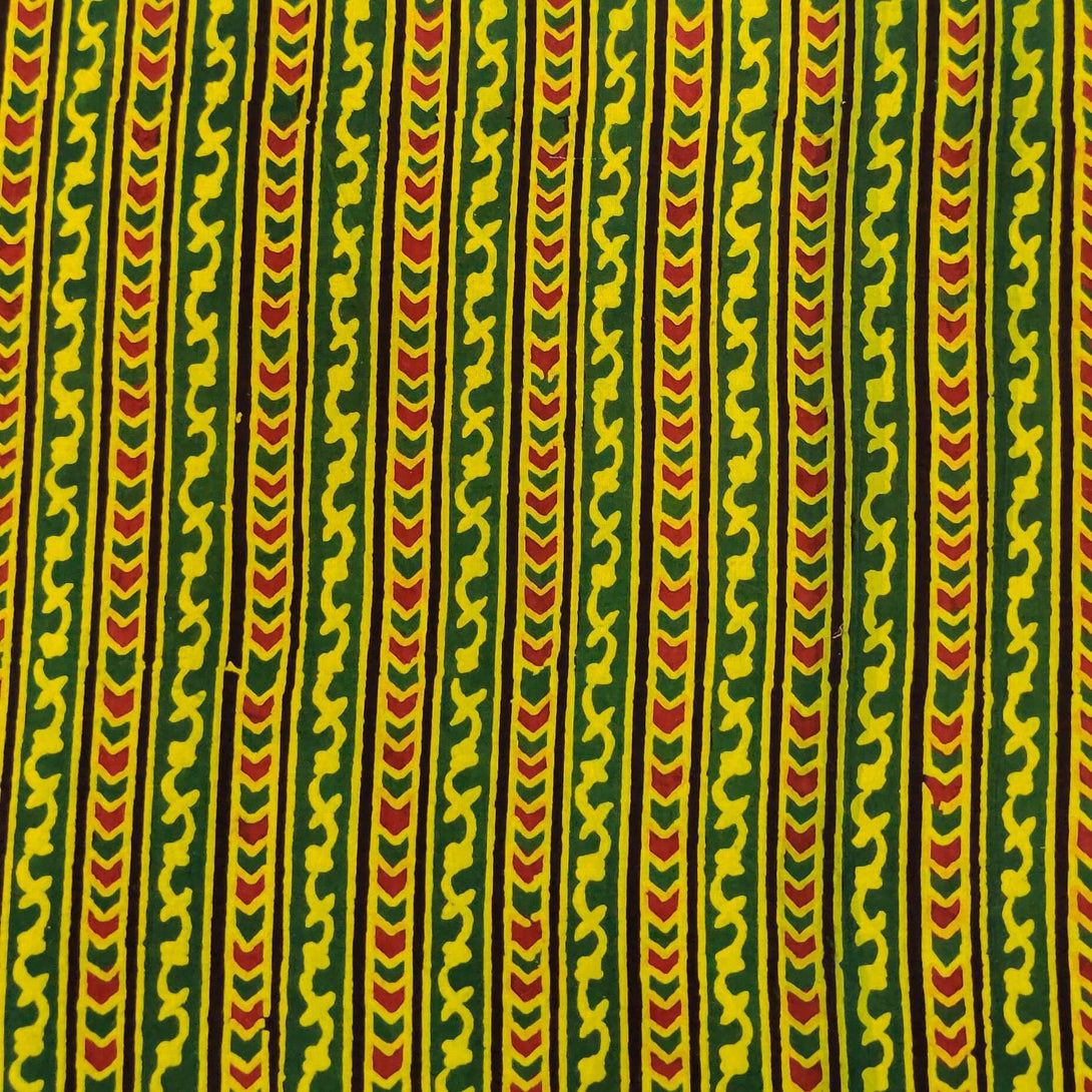 Pre-cut ( 1.40 meter )Pure Cotton Dabu Green Yellow With Intricate Stripes Hans Block Print Fabric