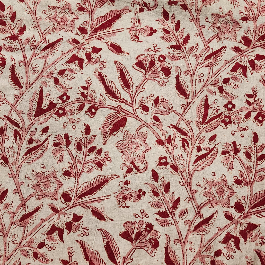 (PRE-CUT 1.40 METER) Pure Cotton Kalamkari Cream With Red Bluebell Flower Jaal Hand Block Print Fabric