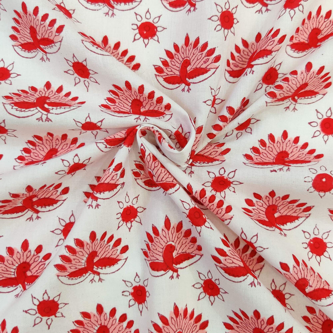 Pre- cut ( 1.45 meter ) Pure Cotton Jaipuri White With Peach Red Dancing Peacock Hand Block Print Fabric