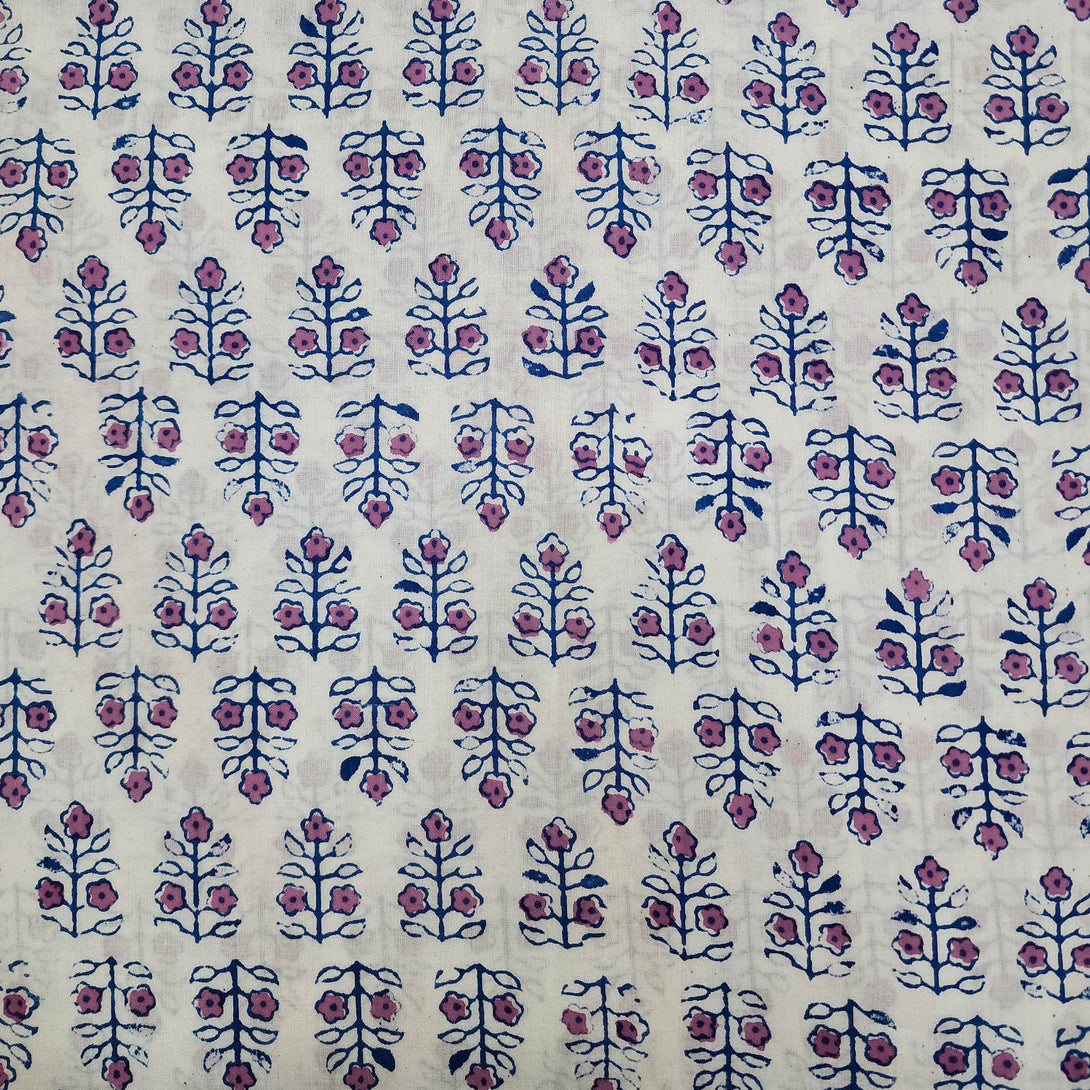 Pre-cut 1.5 meter Pure Cotton Jaipuri Blue With Pink Up And Down Flower Motif Hand Block Print Fabric