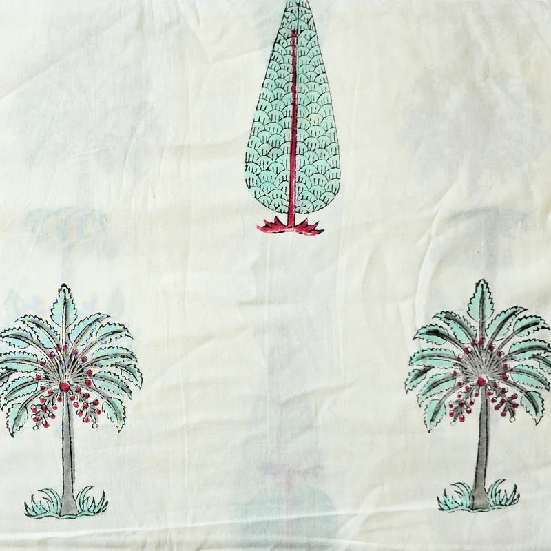 Pre-Cut 1.5 Meter Pure Cotton Jaipuri White With Green Coconut Tree And Cypress Tree Big Motif Hand Block Print Fabric