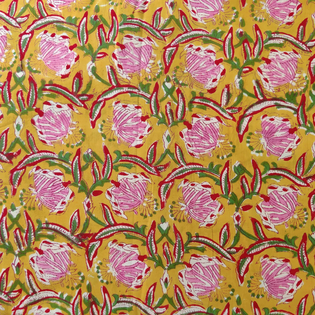 Pre-cut 1.5 Meter Pure Cotton Jaipuri Yellow With Pink Hand Block Print Fabric