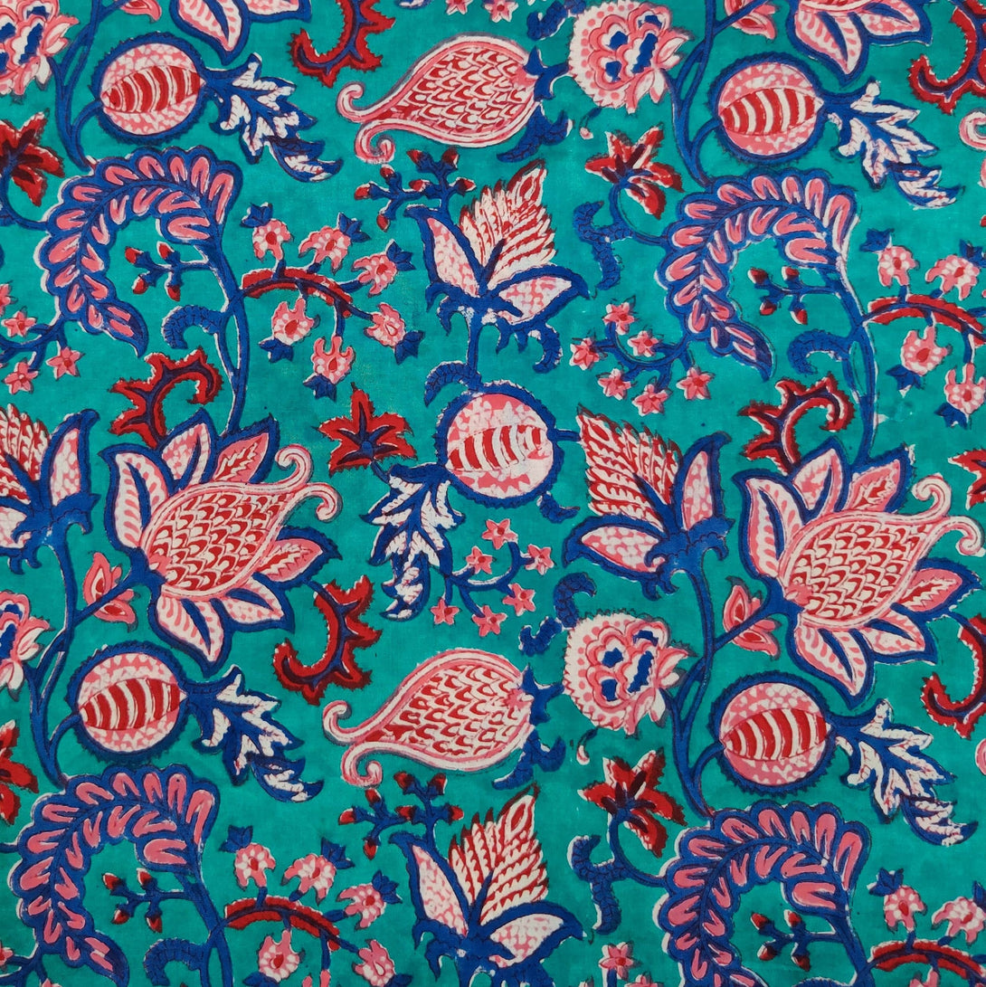 Pre-Cut 1.5 Meters Pure Cotton Jaipuri Blue With Orange Red Dark Blue Wild Wild Jaaal Hand Block Print Fabric