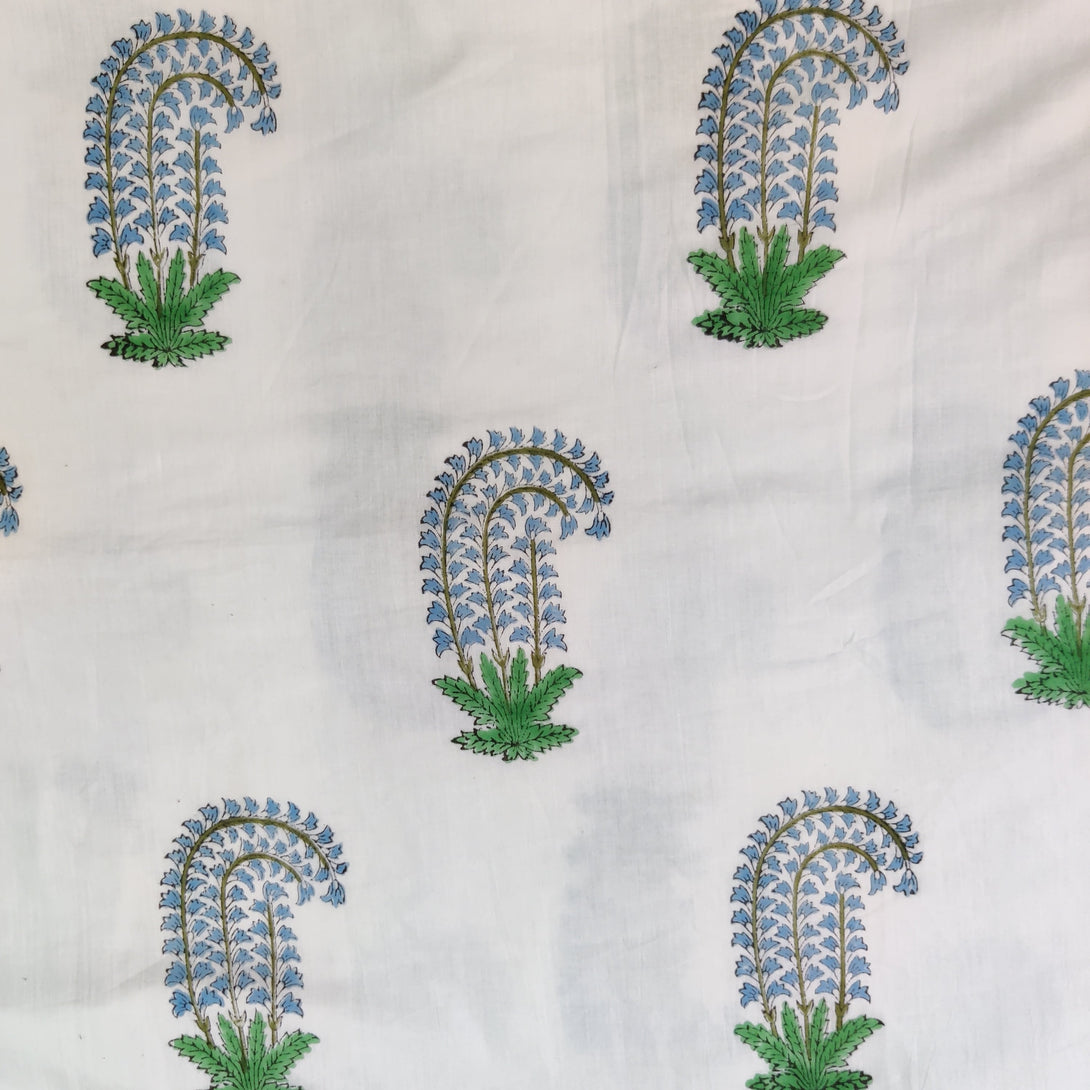 Pre Cut 1.50 Meter Pure Cotton Jaipuri White With Blue Mughal Plant Hand Block Print Fabric