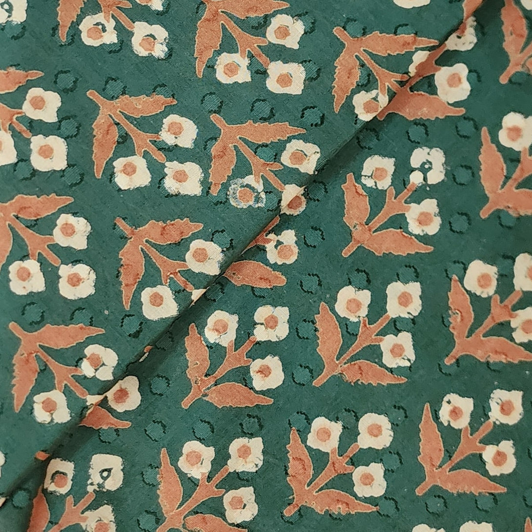 ( Pre-Cut 1.50 Meter ) Pure Cotton Teal Discharge With Cream Orange Grass Flowers Hand Block Print Fabric