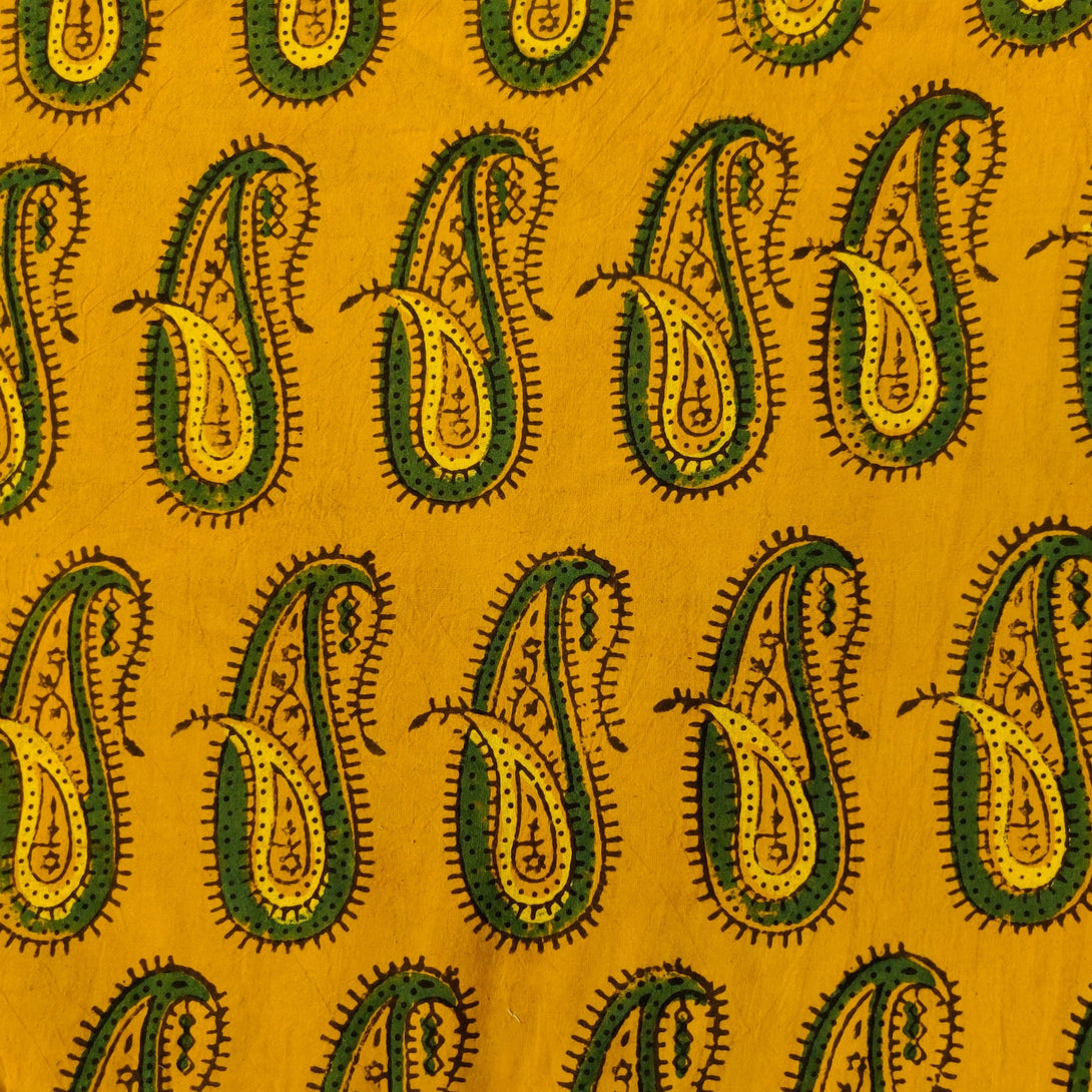 Pre-Cut 1.55 Meters Pure Cotton Ajrak Turmeric Dyed With Green Beautiful Intricate Kairi Motif Hand Block Print Fabric