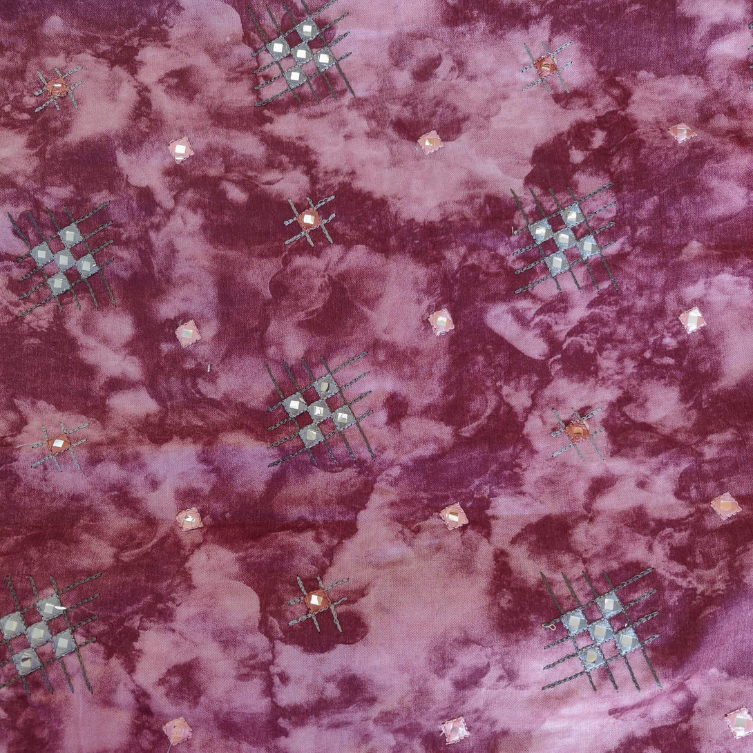 Pre-cut 1.60 meters Glazed Cotton Fabric Purple Textured Print With Mirror Work Geometric Embroidered Motif