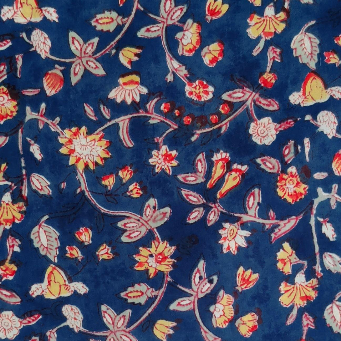 Pre-Cut 1.60 Meters Pure Cotton Jaipuri Blue With Tiny Yellow Red Flower Jaal Hand Block Print Fabric