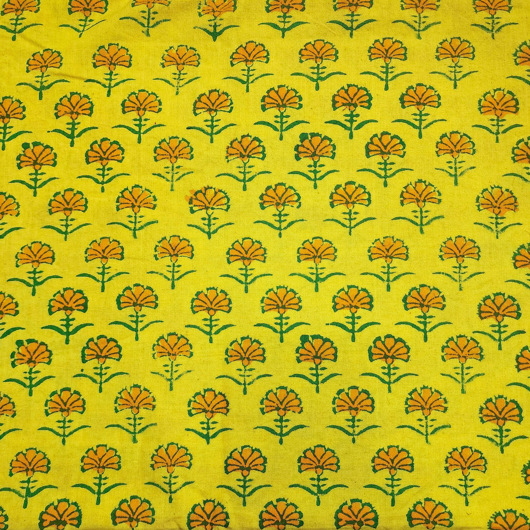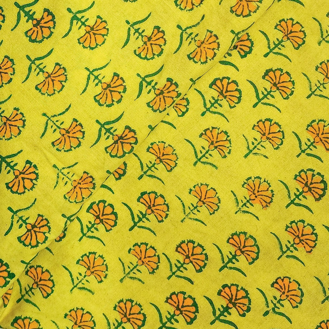 ( Pre-Cut 1.65 Meter ) Pure Cotton Gamthi Yellow With Dark Green And Orange Flower Hand Block Print Fabric