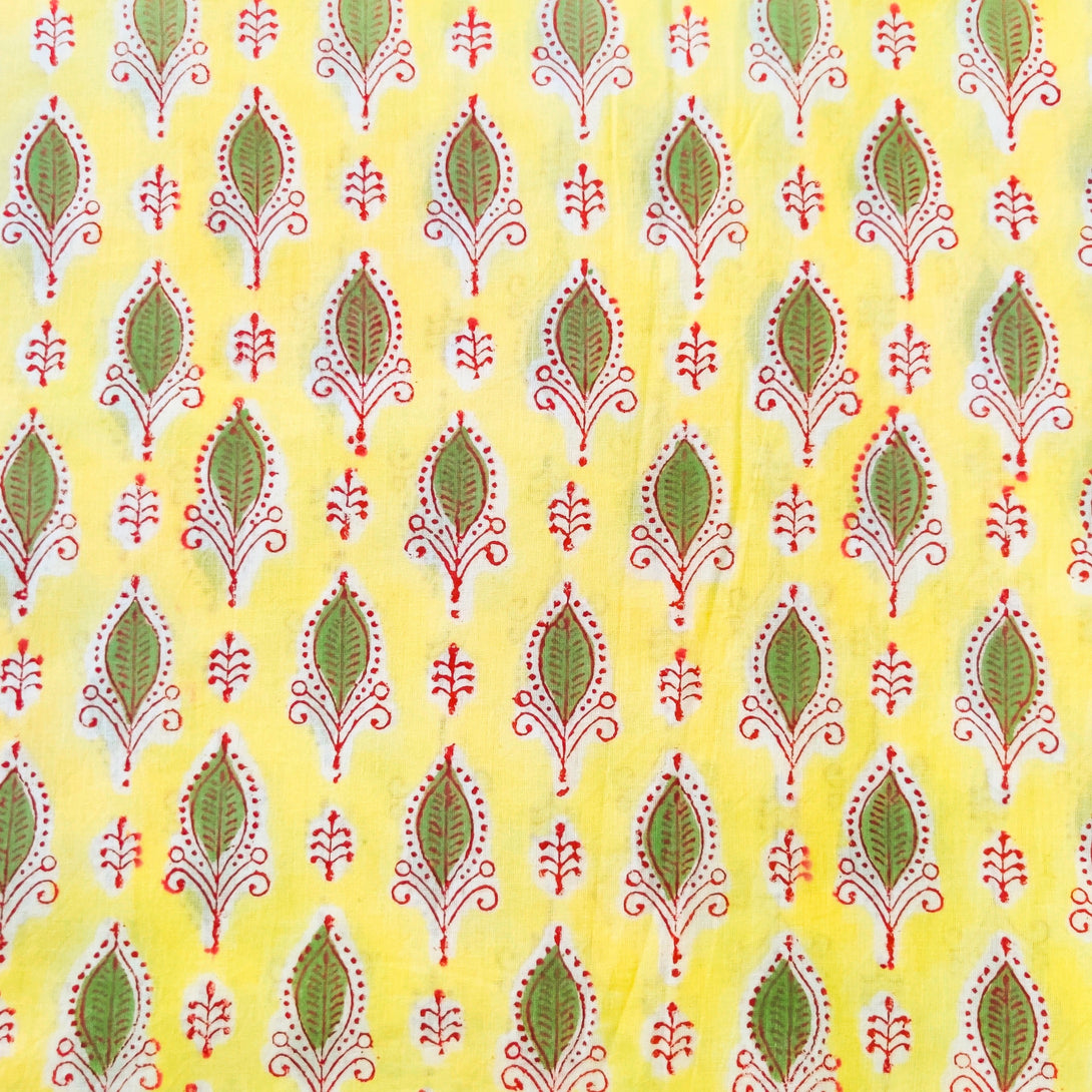 Pre-cut 1.65 meter Pure Cotton Jaipuri Yellow With Green Motifs Hand Block Print Fabric
