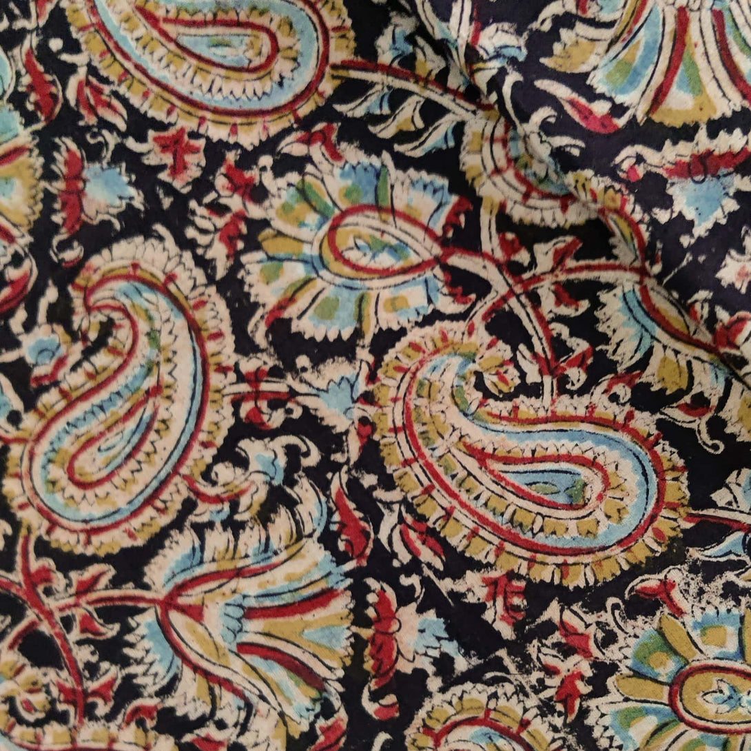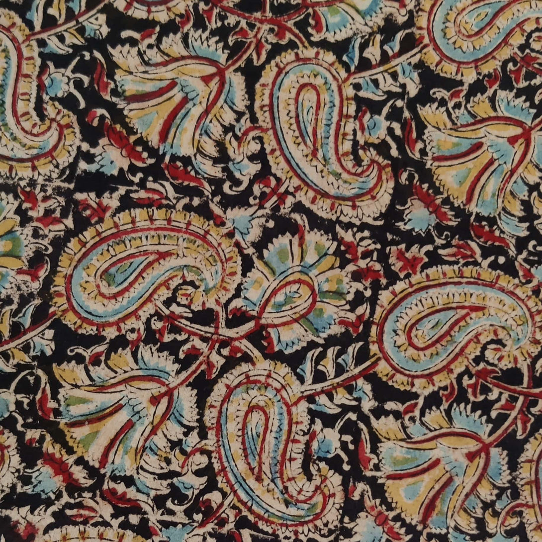 Pre-cut (1.65 meter) Pure Cotton Kalamkari Black With Mustard Maroon Blue Kairi Jaal Hand Block Print Fabric