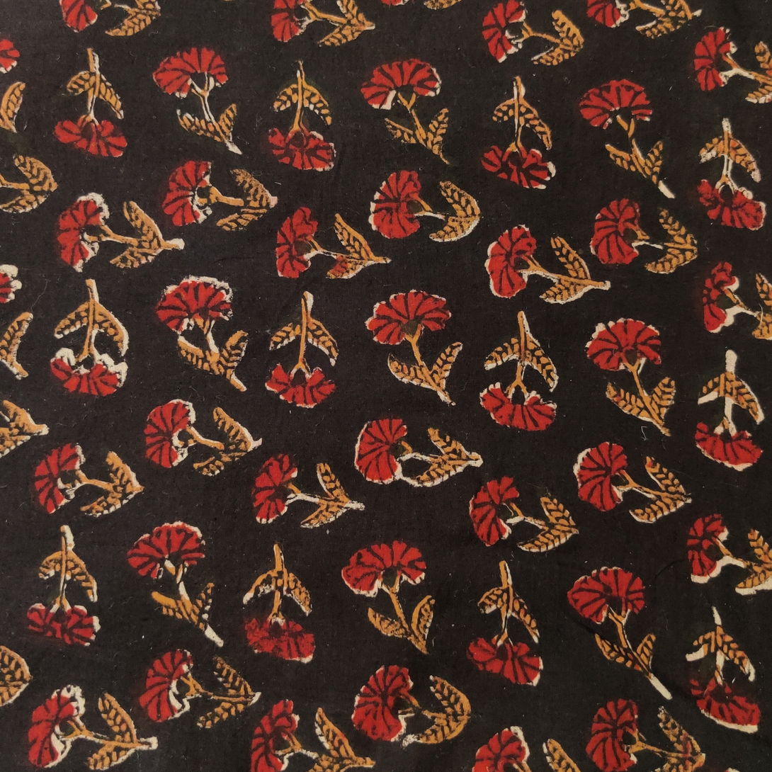 Pre-Cut 1.65 Meters Pure Cotton Bagru Dull Black With Scattered Flowers Hand Block Print Fabric