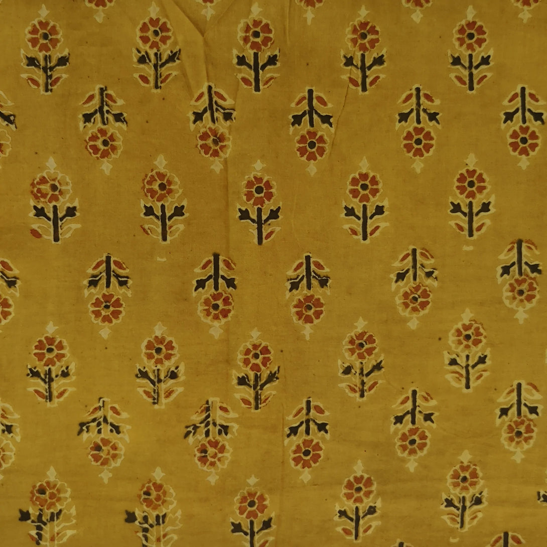 Pre-cut ( 1.70 meter )Pure Cotton Ajrak Turmeric Dyed With Small All Over Floral Motifs Hand Block Print Fabric