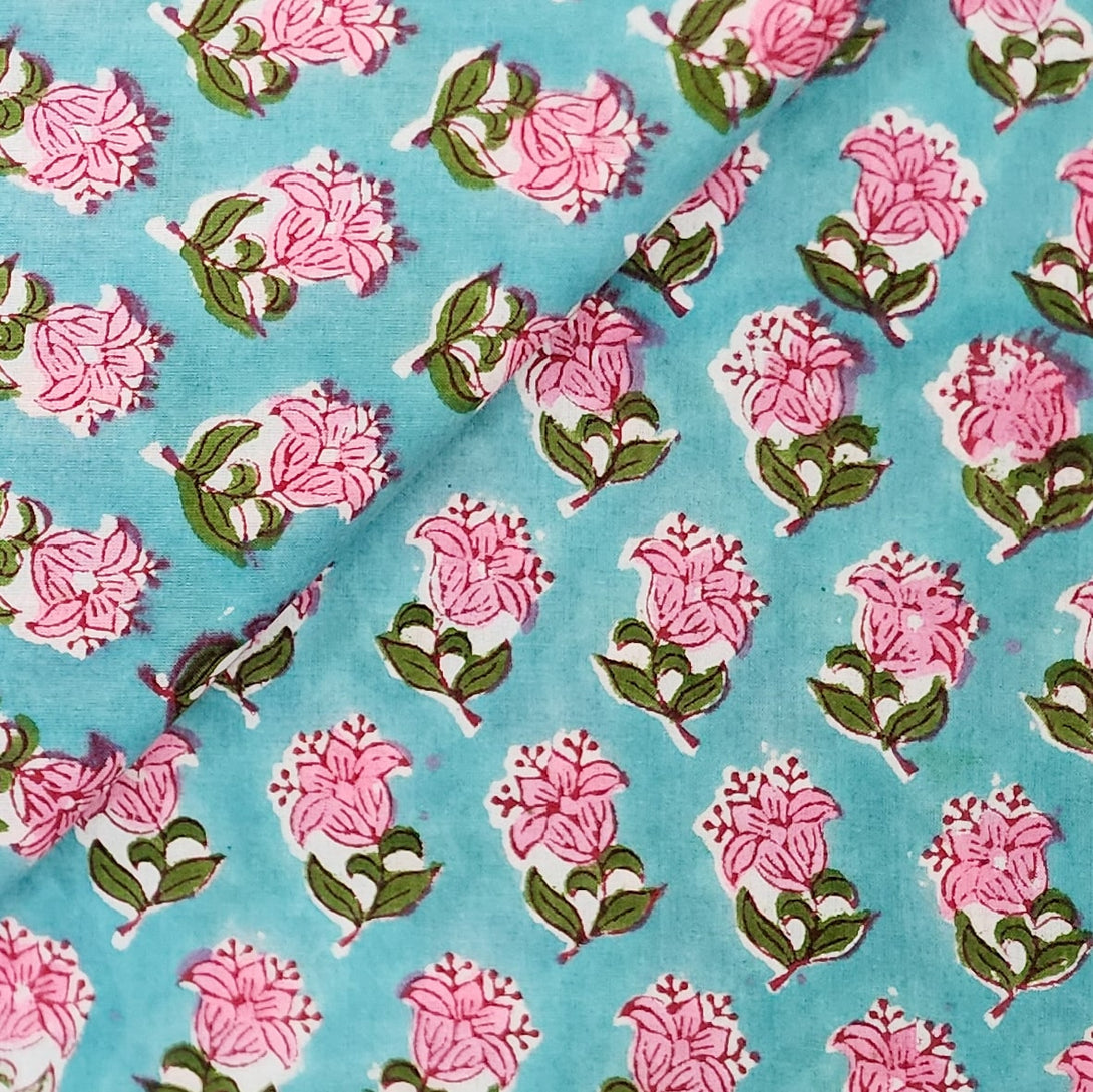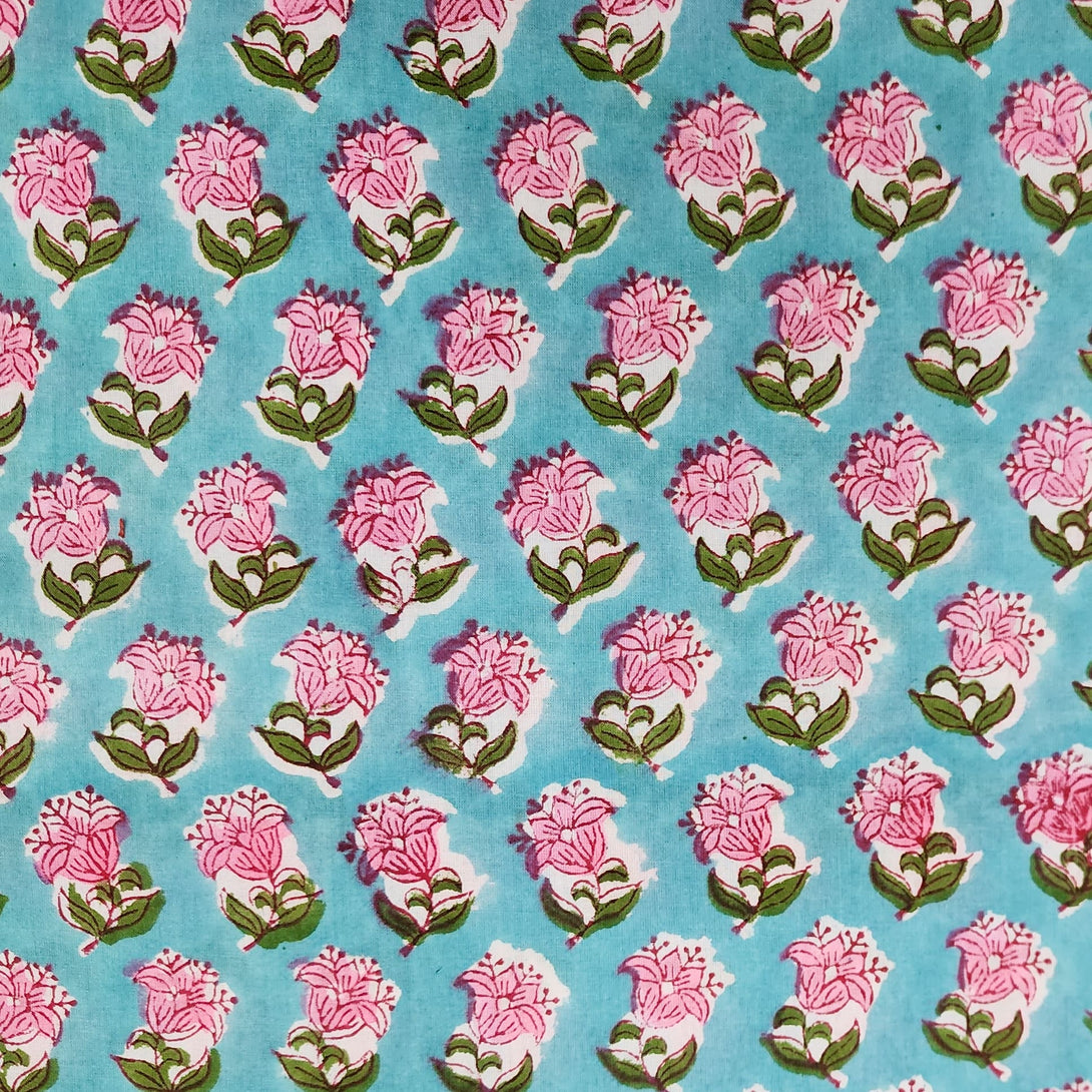 ( Pre-Cut 1.75 Meter ) Pure Cotton Jaipuri Baby Blue With Pink Flower Buds Hand Block Print Fabric