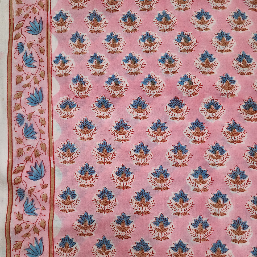 Pre-cut 1.75 meter Pure Cotton Jaipuri Pink With Blue Floral Motifs Hand Block Print Fabric