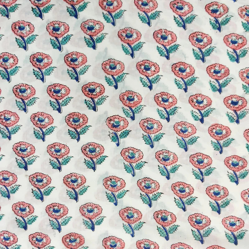 Pre-Cut 1.75 Meter Pure Cotton Jaipuri White With Pink And Blue Flower Bud Hand Block Print Fabric