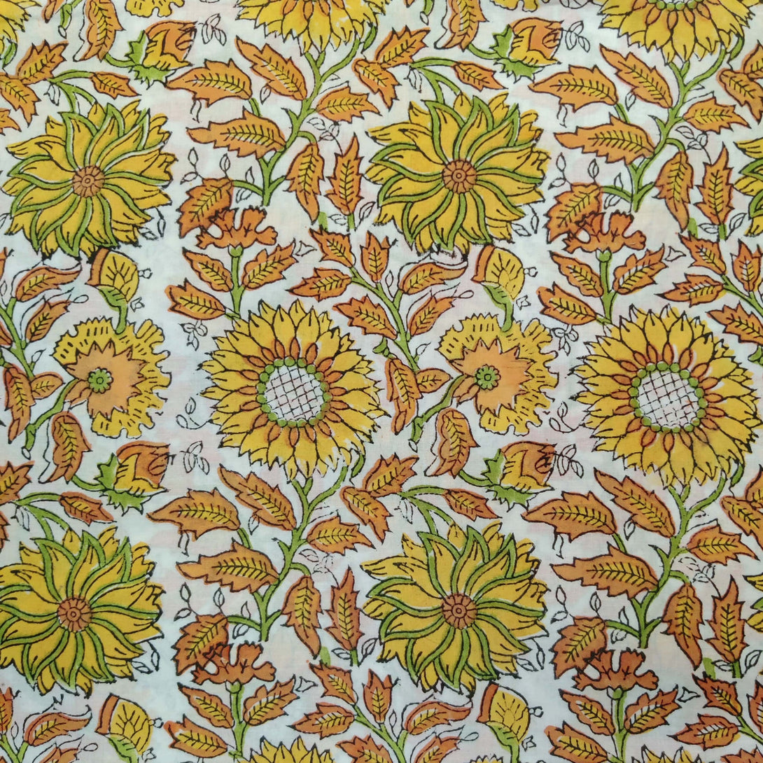 Pre-Cut 1.75 Meters Pure Cotton Jaipuri White With Shades Of Yellow Sun Flower Hand Block Print Fabric