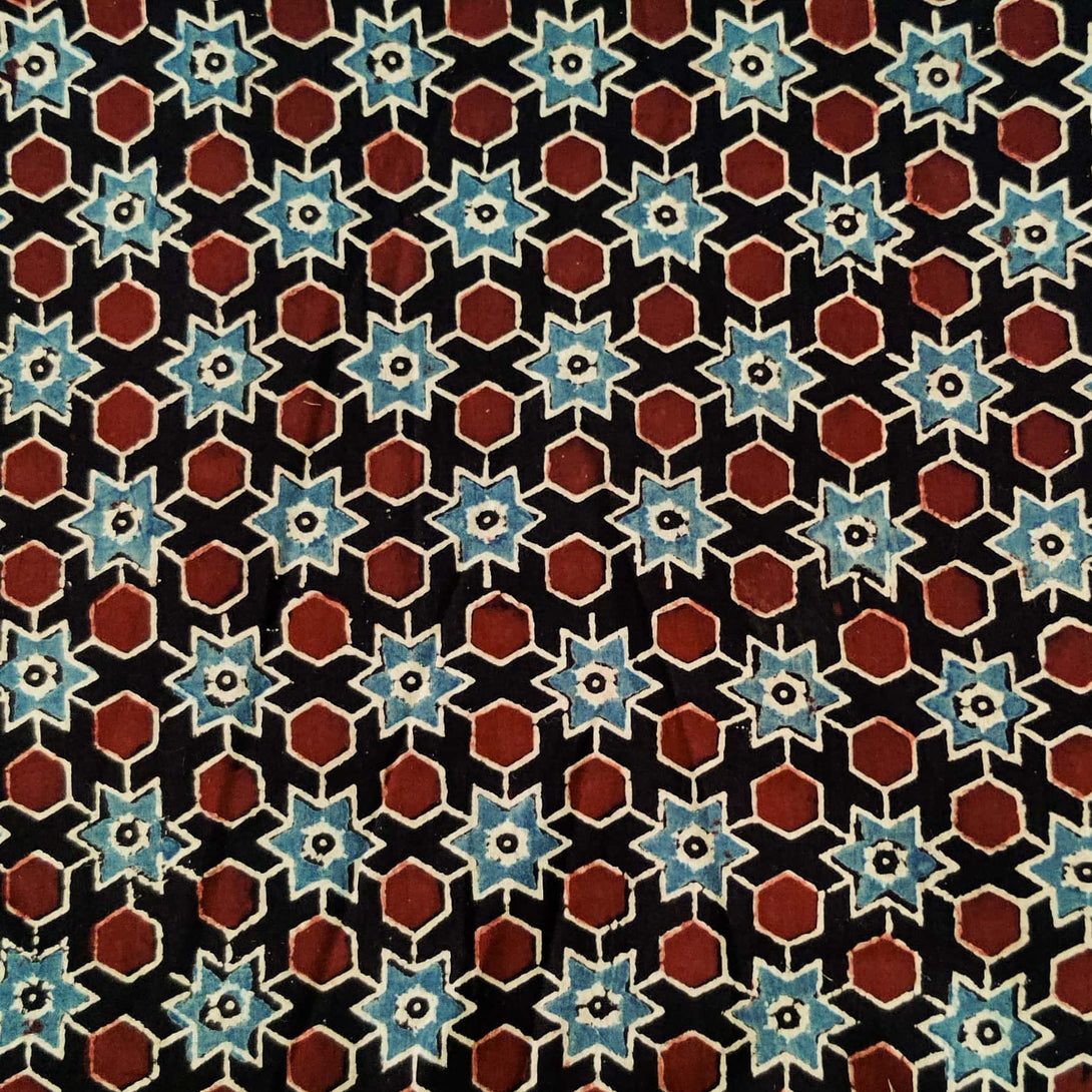 Pre-cut 1.80 meter Pure Cotton Black Ajrak With Red Blue Hexa Star Tile Hand Block Print Fabric