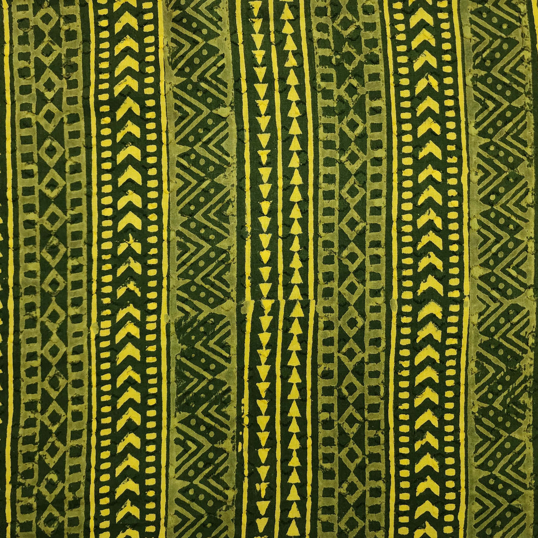 PRE-CUT 1.80 METER Pure Cotton Dark Green Discharge With Yellow Border Stripes Hand Block Print Fabric