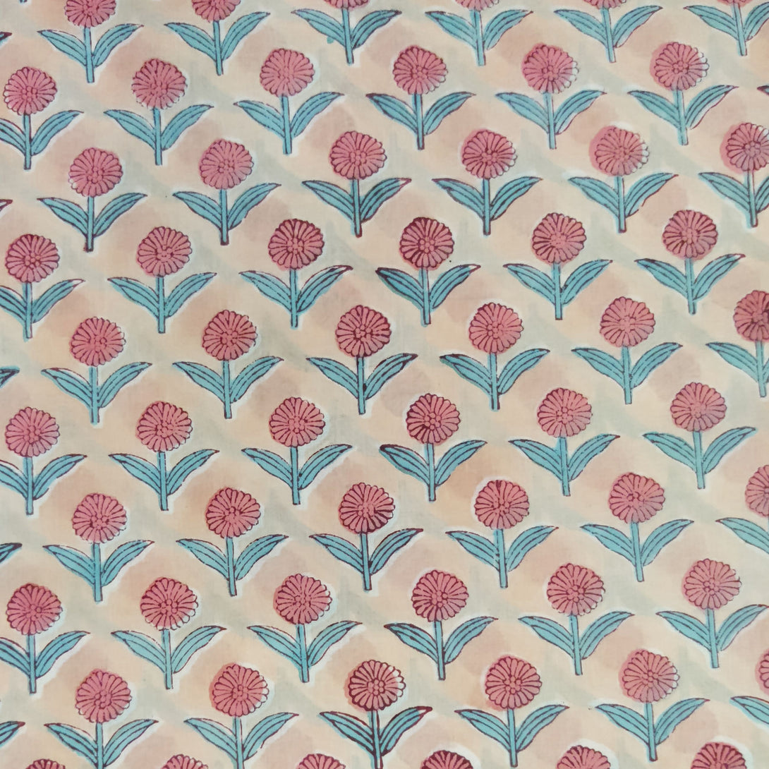 Pre-Cut 1.80 Meter Pure Cotton Jaipuri Light Peach With Drak Peach Flower Motif Hand Block Print Fabric