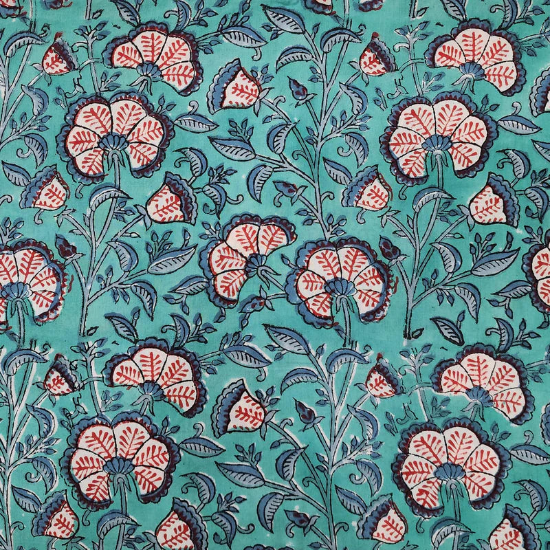 Pre-Cut 1.80 Meter Pure Cotton Jaipuri Mint Green With Red Jungle Flower Jaal Hand Block Print Fabric