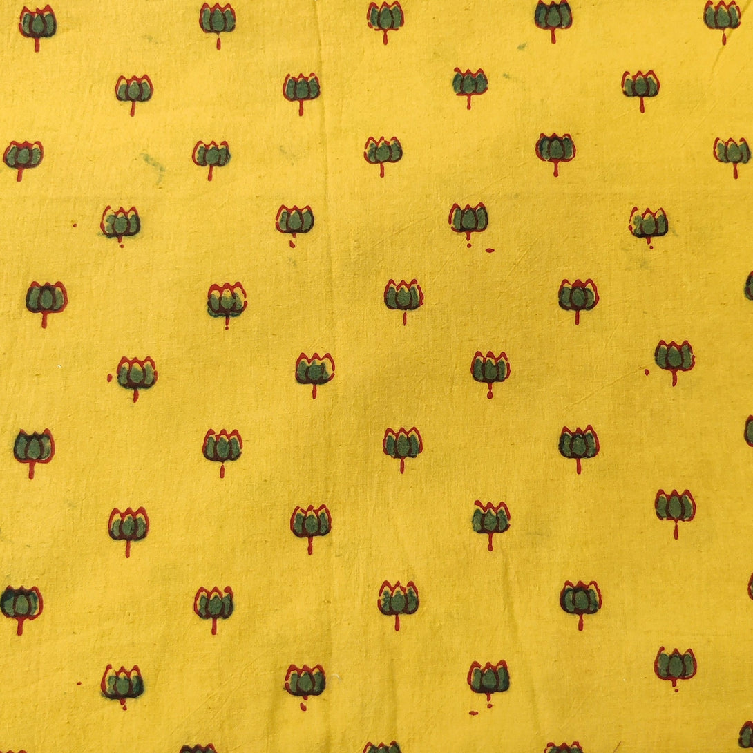 Pre-Cut 1.80 Meters Pure Natural Ajrak Sandy Yellow With Green Lotus Hand Block Print Fabric