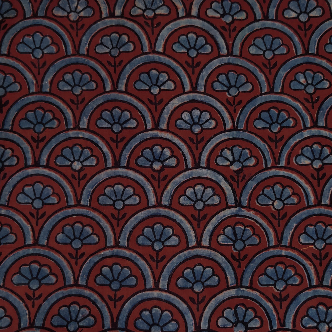 Pre-cut 1.85 meter Pure Cotton Ajrak Rust With Blue Shell Flower Motifs Hand Block Print Fabric