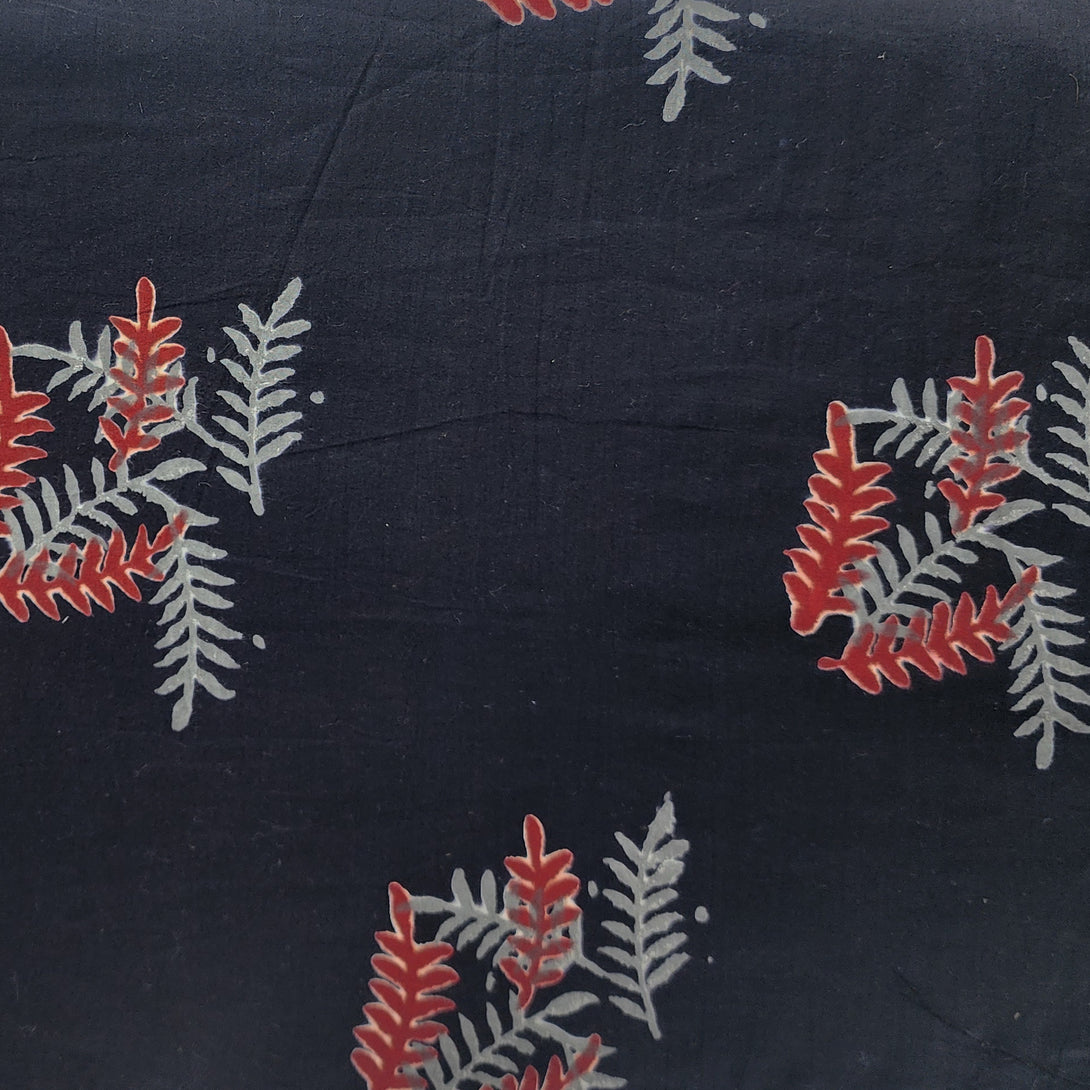 (PRE-CUT 1.90 METER) Pure Cotton Black And White With Red Leaves Motif Hand Block Print Fabric