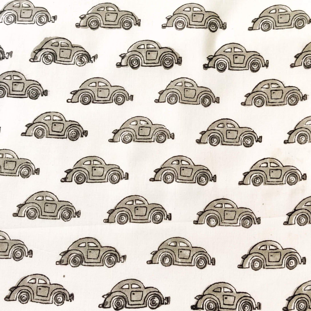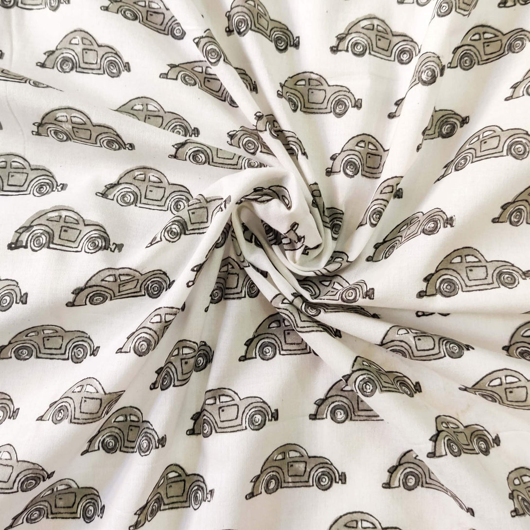 Pre- cut ( 1.90 meter ) Pure Cotton Jaipuri White With Grey Car Hand Block Print Fabric